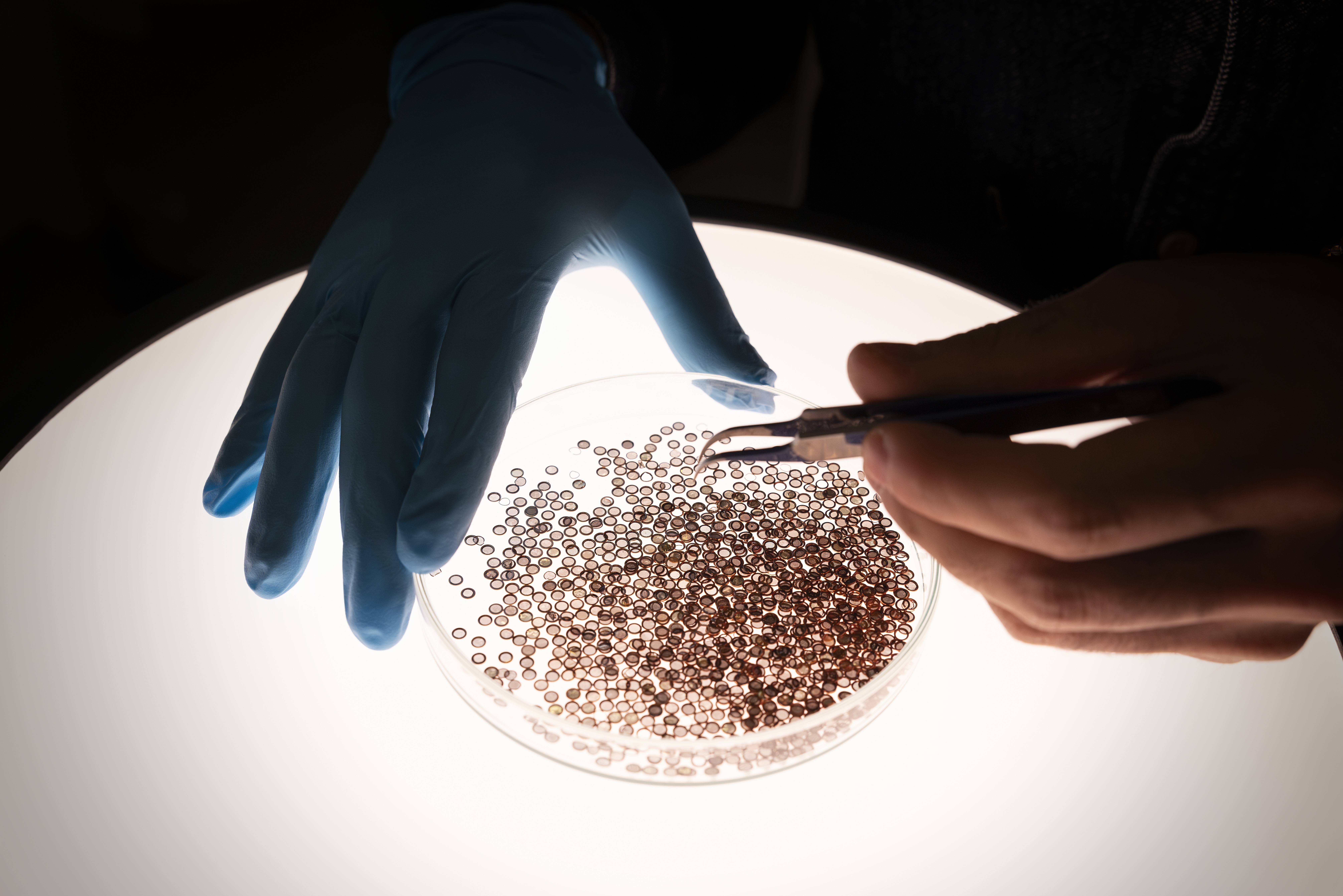 Photo of used autogrid cartridges in a glass petri dish with a gloved user sorting through with a pair of forceps. |